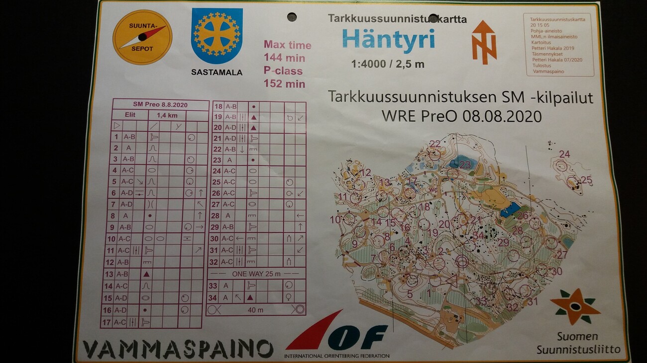 SM-tarkkuussuunnistuksessakin edustus (ja tarinaa lajista) SM-tarkkuussuunnistus kilpailtiin Mäntsälässä (29.8.). Elit-sarjassa Veijo Viitanen sijoittui toiseksi parhaana varsinaissuomalaisena 41. tilalle, koko kilpailussa 45. tilalle. Rasteja kahdella kartalla peräti 34 kappaletta, joista oikea pihtileimaus 24 lipulta. Sijoitukseen vaikuttaneesta temposta tuli kaksi virhettä (4 / 6). Suoritusajan maksimi oli 2 tuntia 15 minuuttia, johon VaRa-edustajan kestävyys ei nytkään riittänyt. Jo ennen SM-kisaa nolo virhe - ajomatkan arvioinnissa huomattava moka! Hirveä kiire starttiin, ylinopeussakkoa ei ole vielä tullut perille. Keskittyminen tuollaisesta raastavasta kiireestä tietysti kärsi. Yhden päivän SM-osanotto vei seitsemän tuntia autoilussa ja kolme tuntia suunnistuksessa. Vuosi sitten lajimuodon SM-kisa oli lähempänä Sastamalassa ja töppäys sinnekin: ilmoittautuminen määräajassa unohtui eikä päivää myöhässä päässyt mukaan kuin WRE-kilpailuosioon. Hienoa tietysti sekin ELIT-sarjassa. Mutta ovat nämä kilpasuunnistajan rutiinit hiukan hakusessa. Vanhana raporttina vielä, että tuo Vammalan PreO (8.8.2020) sujui aika hyvin: 34 rastia, 28 oikein. Tempon 6 rastia kaikki OK. SM-sijoitus epävir. 32. tila, WRE-kisan sijoitus 41. tila, taas ilman maailmanrankin pisteitä... Kahden vuoden SM-rastien välissä koronan kaventamassa kalenterissa oli vain Elit-sarjan kisa (18.10.2020) Turun Pansiossa. Yhtä isoa mäkeä kierrettiin, paikannuksessa 33 rastia joista 23 oikein, sijoituksena 30. tila. Tempo meni taas virheittä nappiin 3/3. Tällä kisatahdilla ei opi millään lajin nykytyyliä. Vaatii melkoista tarkkuutta, kun laserkeilatut kartat ovat 1:4.000 mittakaavaan. Jos lippu on neljän metrin päässä oikeasta kohteesta, se on vielä oikein, mutta jos se on viiden metrin päässä kohteesta, se on Zero (nollarasti eli virheellinen liputus). Ja karu totuus: uudet silmälasit pitää ainakin hankkia maaston/lippujen näkemiseen.