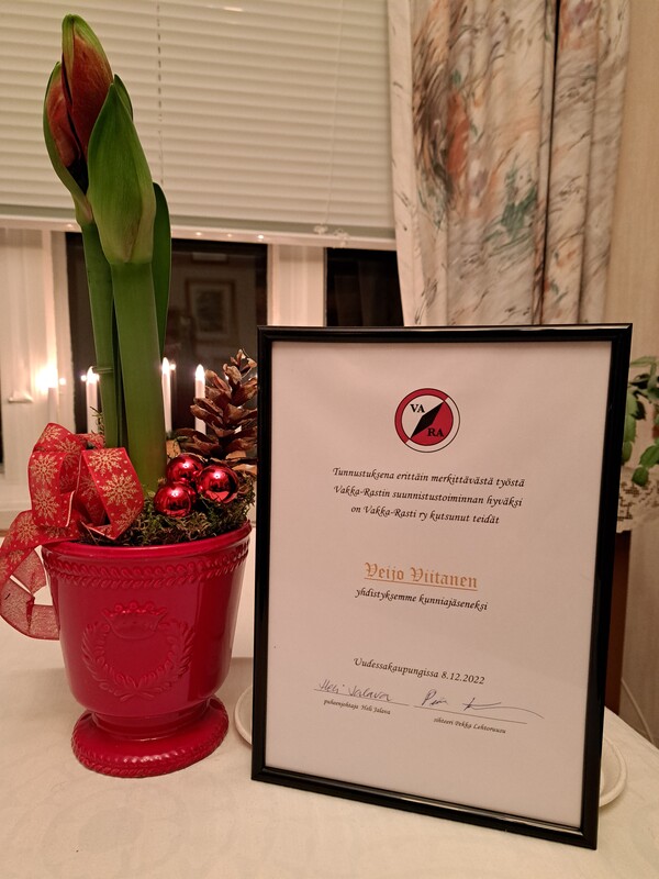 Seuramme sääntömääräinen vaalikokous (8.12.) pidettiin 50-v. juhlavuoden toiseksi viimeisenä yhteisenä tilaisuutena. Palaverissa tehtiin henkilövalintoja ja vahvistettiin suunnitelmia sekä kutsuttiin uusi kunniajäsen. Juhlavuoden yhteinen kokous aloitettiin hiljaisella hetkellä syksyllä edesmenneitten kahden jäsenen muistolle. Jukka Walio (k. 23.9.2022) oli seuran perustajajäsen ja Veijo Nurmi (k. 1.12.2022) seura-aktiivi varsinkin karttojen parissa eri vuosikymmenillä.