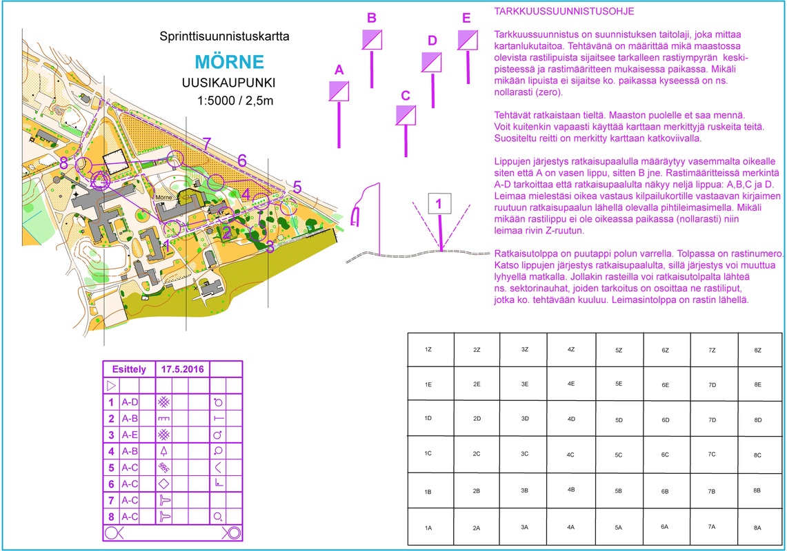 Tiistain (17.5.) kuntorastien yhteydessä on ensi kertaa mahdollisuus tutustua tarkkuussuunnistukseen Uudessakaupungissa. Radan voi kiertää joko ennen tai jälkeen kuntorastien suorituksen, myös pelkkään tarkkuussuunnistukseen voi osallistua. Osanottajat ohjataan alkuun. Tarkkuussuunnistuksessa ei mitata fyysistä suoritusta, vaan laji perustuu päättelytehtäviin. On ratkaistava, mikä 2-5 rastilipusta vastaa karttaan merkittyä ja määritteillä tarkennettua rastia. Tehtäväpisteet eli rastit sijoitetaan hyväpohjaisen kulku-uran, Mörnen maastoissa jopa asfaltoidun polun, varrelle. Myös liikuntarajoitteiset voivat osallistua! Rataa ei merkitä maastoon, U:gissa taajamasta johtuen kulku-ura on tosin merkitty karttaan. Lajin kokeileminen sopii niin tämän kevään suunnistuskurssilaisille kuin kokeneemmillekin kuntoilijoille. Erityisen hyvä harjoitus on kartanlukua opetteleville lapsille. Mm. kesäkuun Leimaus-leirillä Ikaalisissa on ohjelmassa tarkkuussuunnistusta. Tarkkuussuunnistus on saanut alkunsa vammaisurheiluna Ruotsissa 1970-luvun alussa. Suomeen laji tuli 1990-luvun puolivälissä ja siis vihdoin nyt myös Vakka-Rastiin, tosin vielä vain esittelynä kunto-terveysliikuntatapahtuman yhteydessä. Ohjeita suunnistuksen taitolajiin Tehtävänä on määrittää, mikä maastossa olevista rastilipuista sijaitsee tarkalleen rastiympyrän keskipisteessä ja rastinmääritteen mukaisessa paikassa. Mikäli mikään lipuista ei sijaitse ko. paikassa, kyseessä on ns. nollarasti (zero). Tehtävät ratkaistaan tieltä. Maaston puolelle et saa mennä. Voit kuitenkin vapaasti käyttää karttaan merkittyjä ruskeita teitä. Suositeltu reitti on merkitty karttaan katkoviivalla. Maastossa joka rastilla 2-5 lippua Lippujen järjestys ratkaisupaalulla määräytyy vasemmalta oikealle siten, että A on vasen lippu, sitten B jne. Rastinmääritteissä merkintä A-D tarkoittaa, että ratkaisupaalulta näkyy neljä lippua: A, B, C ja D. Leimaa mielestäsi oikea vastaus kilpailukortille vastaavan kirjaimen ruutuun ratkaisupaalun lähellä olevalla pihtileimasimella. Mikäli mikään rastilippu ei ole oikeassa paikassa (nollarasti), niin leimaa rivin Z-ruutuun. Ratkaisutolppa on tärkeä puutappi Ratkaisutolppa on puutappi polun varrella. Tolpassa on rastinumero. Katso lippujen järjestys ratkaisupaalulta, sillä järjestys voi muuttua lyhyellä matkalla. Jollakin rasteilla voi ratkaisutolpalta lähteä ns. sektorinauhat, joiden tarkoitus on osoittaa ne rastiliput, jotka ko. tehtävään kuuluu. Leimasintolppa on rastin lähellä.