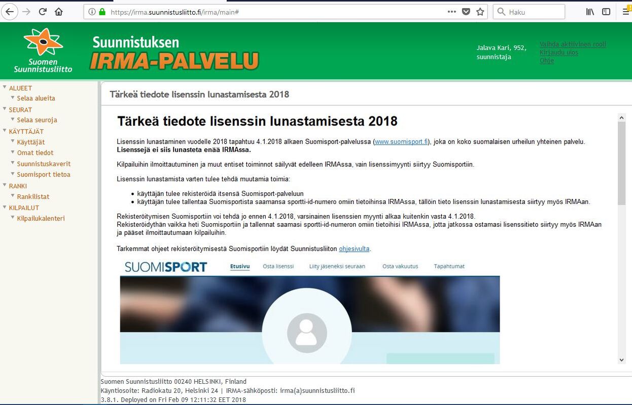 Suunnistuksen kilpailulisenssin lunastaminen on muuttunut vuonna 2018. Jatkossa lisenssit (ja mahdollinen vakuutus) hankitaan Suomisport-palvelusta (suomisport.fi). Kevällä käyttöön tulevaan kuntorasti -sivustoon Rastilippuun kirjaudutaan myös Suomisport profiilin kautta. Kilpailuihin ilmoittautuminen on edelleen IRMAssa, ja siitä Vakka-Rastissa nykyisin vastaa Kari J. Vakka-Rasti maksaa edeleen nuorten lisenssit, kun huoltaja on sen ensin lunastanut Suomisport -palvelusta. Maksun saa takaisin lähettämällä tilinumeron puheenjohtaja Helille (VaRa ei maksa vakuutuksia). Tietoja VaRan osanottomaksuista Mikäli aiot tänä vuonna osallistua lisenssin vaativiin kilpailuihin, hoida lisenssi asiasi nyt kuntoon. Tarkempia ohjeita lisenssin lunastamiseen SSL:n sivuilla terv. |
