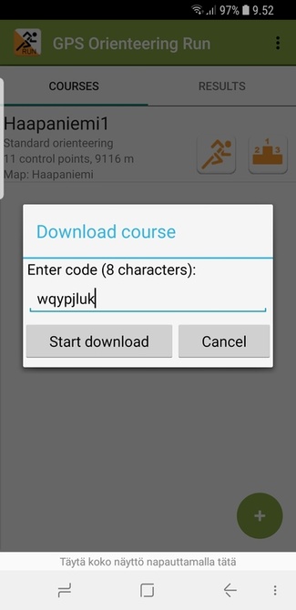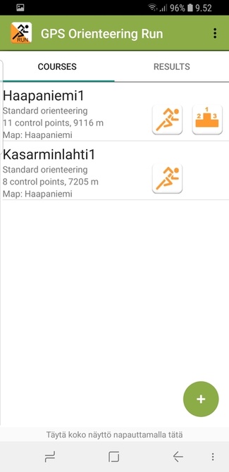 Testaaksesi GPS Orienteering Run -ohjelmaa lataa esim. koulukeskuksessa kiertävä rata koodilla rtypjr1w ja kartta koodilla btqpj9jv