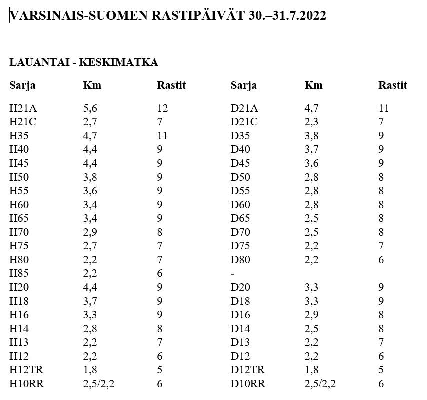 Sarjat, matkat ja rastien määrät