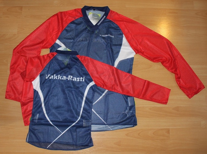 Vakka-Rasti teksti selässä ja edessä. Värit sama kuin lyhythihaisessa Hinta on digitaalipainettuna 45 euroa/kpl.