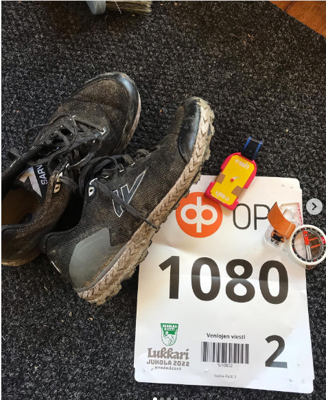 Mieleen on jäänyt useampikin ystävällinen kanssavenla, joiden kanssa etsittiin jotain rastia toisiaan lähellä olevien hajoomien alueella. Ensimmäinen tällainen oli parin kallionnyppylän reunalla, jonne päädyin yrittämällä juosta yhden ”me ollaan ihan vaan höntsäjoukkue”- naisen perässä. En jaksanut höntsätahtiin ja jäin vähän irti kartasta. Yhdeltä venlalta sain kourallisen rusinoita ja pähkinöitä, kun valittelin ettei ole energiaa mennä. Kerran kaaduin aika komeasti, mutta en saanut edes mustelmaa siitä pyllähdyksestä. Aika monesti valitsin suoremman reitin ylös ja alas kallioita, onneksi oli nastarit. Sieluun vähän sattui kun oli pakko malttaa välillä kävellä ja antaa sykkeen tasaantua, mutta joukkueenkin takia maaliin pääsy oli kuitenkin se tärkein tavoite. Kahden juomarastin urheilujuomat, kanssakilpailijan rusinapähkinät ja oman kehon energiavarastot lopulta veivät maaliin saakka.