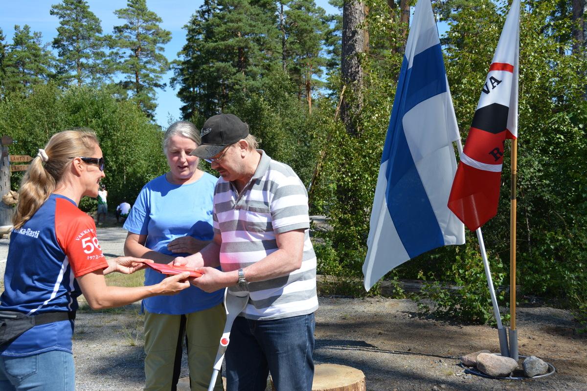 Tärkeä hetki oli muistaa ja kiittää kilpailukeskusalueen maanomistajia. Satu ja Jouni Itätalo saivat kiitokset hienon alueen tarjoamisesta suunnistajille. Ja nimenomaan tarjoamisesta - lupa tuli oikeastaan jo ennen kuin Vakka-Rastin lähetystö sitä ehti pyytääkään.