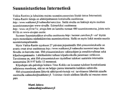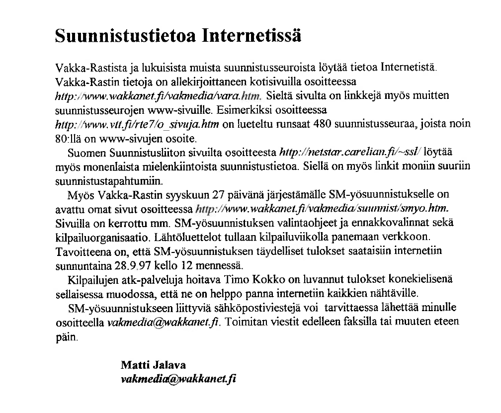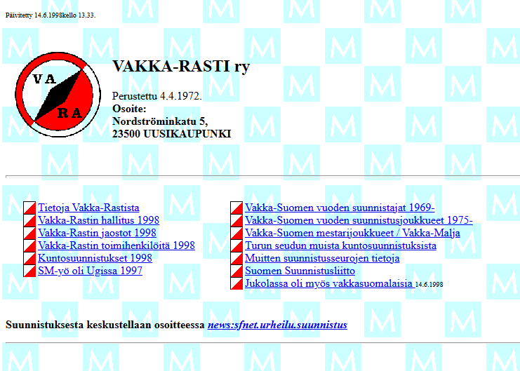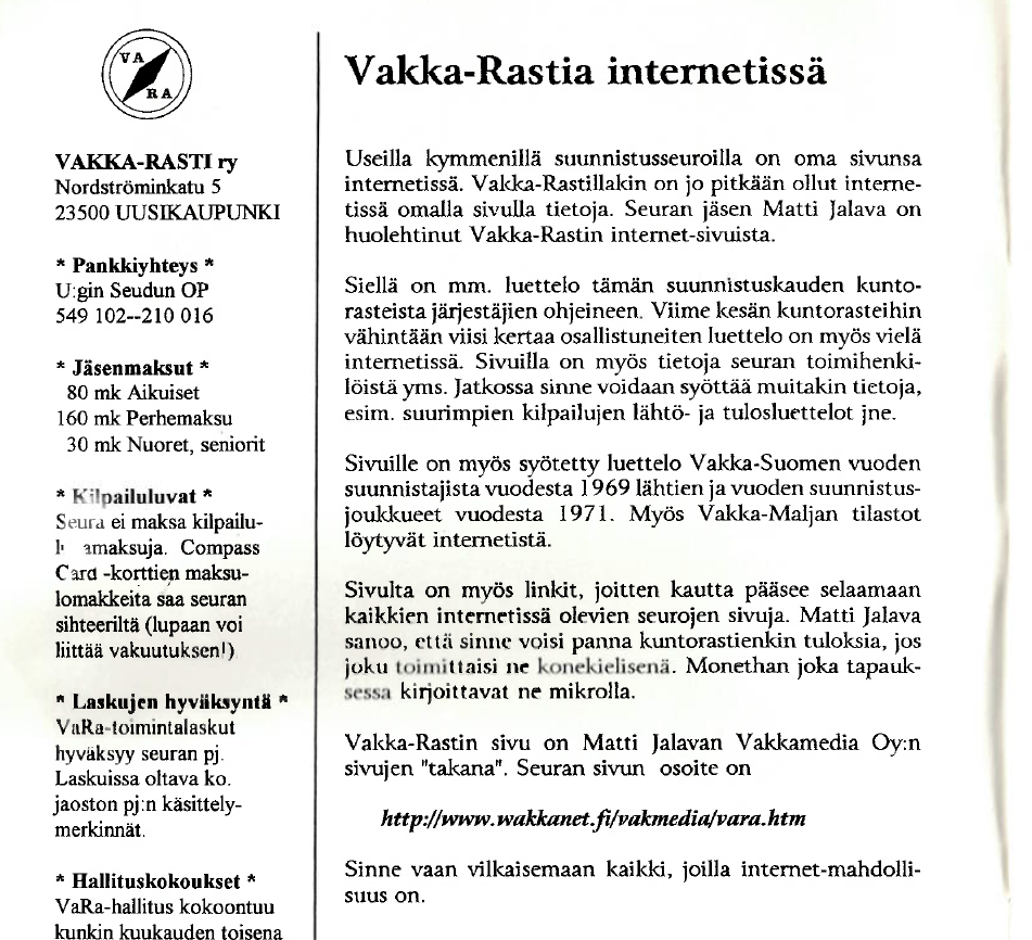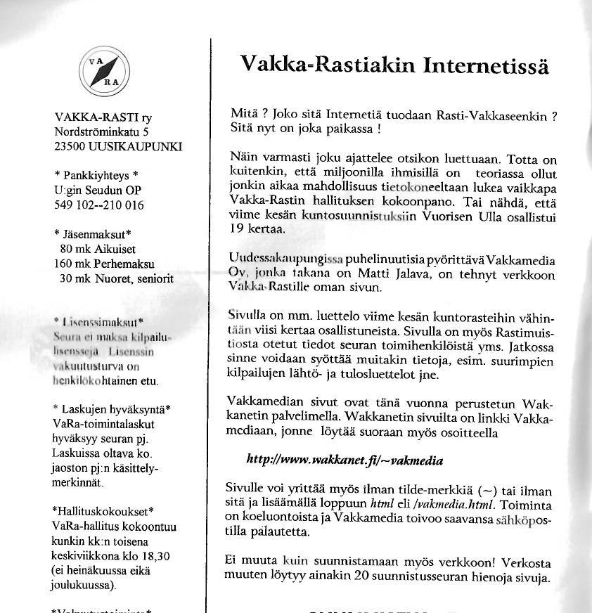 Vakka-Rastilla on ollut omat kotisivut vuodesta 1995 alkaen, yksi ensimmäisistä suunnistusseuroista. Alla kuvia Rastivakkasista 1995-2, 1996-1 ja 1997-1 sekä vuoden 1998 VaRan etusivu.