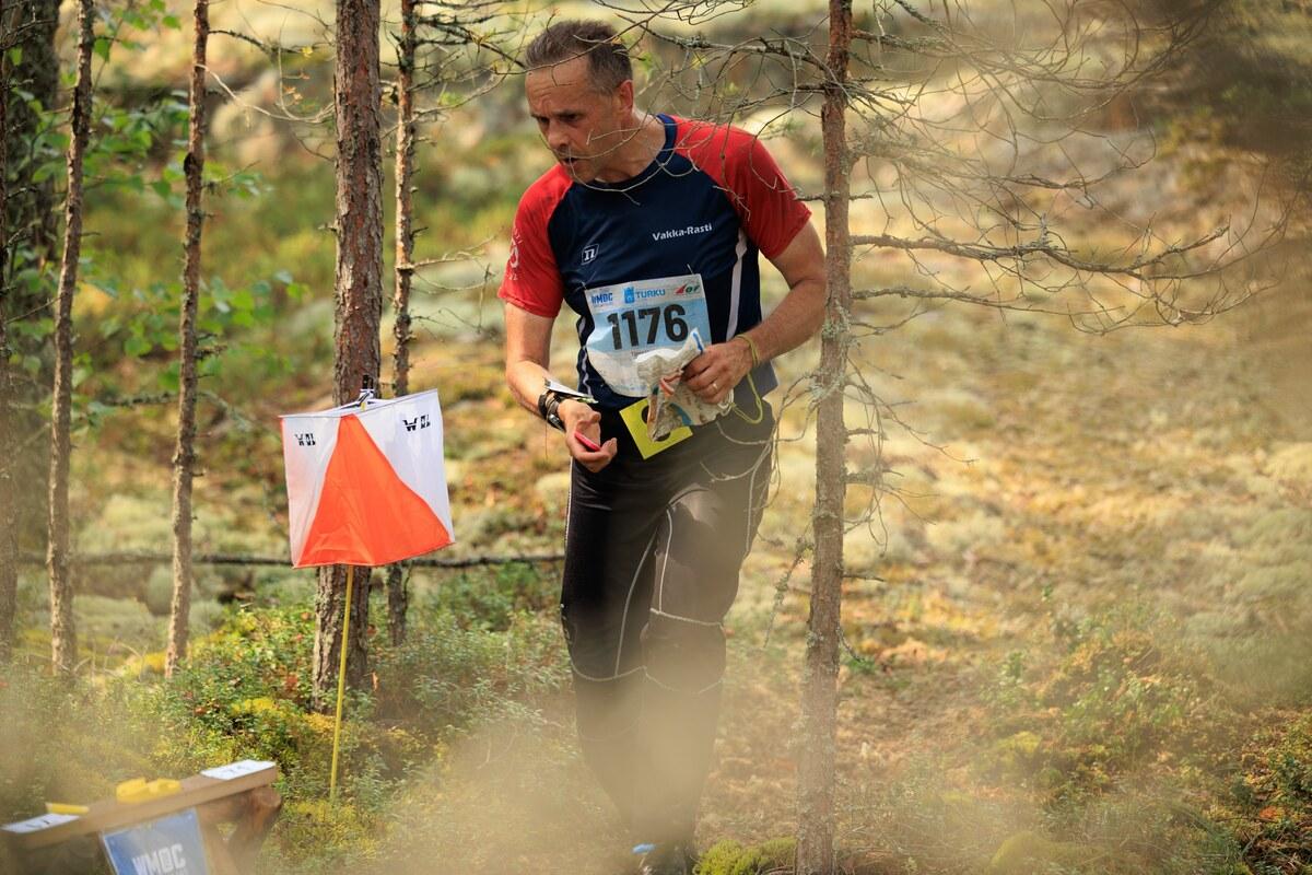 Välipäivän jälkeen veteraanien suunnistuksen maailmanmestaruuskilpailut jatkuivat Rymättylässä. Vuorossa oli pitkän matkan finaali. Sarjassa M55 radan pituus oli 7,4 km ja radassa 13 rastia. Kilpailijat lähetetään maastoon kahden minuutin välein käännetyssä järjestyksessä keskimatkan kilpailun tulosten mukaan. Timon jälkeen lähtöluettelossa oli seitsemän kilpailijaa, viimeisenä maailmanmestari Gjermund Urset. Kilpakumppaninsa kanssa Timo aamulla spekuloi, että 50 minuutin loppuajalla voisi olla lähellä mitalia. Loppuviitoituksella saimme maastosta väliaikoja kahdelta rastilta. Väliajat lupailivat kohtuullista sijoitusta. Takaa-ajajista jotkut saivat parempia väliaikoja kuin Timo vaikka ensin tulikin kärkiaika. Aloimme jännittää, koska hän tulee näkyviin viitoitukselle. Samassa, ennen tavoiteaikaa 50 minuuttia, mies rynnisti alamäkeen. No nyt näyttää hyvältä. Vauhti viimeisissä mutkissa ja loppusuoralla oli tosi kova. Vauhti oli maksimaalista. Kaikki oli pelissä. Menimme Timoa vastaan maalille. Sitten alkoi tuskien 14 minuuttia, kuinka moni menee ohi? Timo alkoi miettimään, "kiersin polun kautta vihreää rastille. Olisiko sittenkin pitänyt mennä suoraan, kun siitä tuli niin iso mutka". Timon suunnistuksen tavaramerkki on suora linja, ei mitään kaarroksia. Meistä kartalla rauhassa katsottuna, kierto näytti ihan hyvältä. Jälkitarkastelussa kaikki kärkimiehet olivat kiertäneet polun kautta. Sitten tuli seuraava arvuuttelu. "Mennessäni vihreän läpi siellä keskellä oli polku jota ei ollut kartassa. Seurasin sitä hetken sivusuuntaa ja jatkoin sitten suunnassa. Hetkeen en tiennyt missä tarkalleen olen. Sain kuitenkin suhteellisen nopeasti kiinni kartasta." Onneksi oli pitkä väli. "Se ylimääräinen polku oli avoimelle uralle heinikkoon suunnistajien tallaama ura. Muuten olin hyvin kartalla", totesi Timo. "Viimeisen pitkän välin otin tosi tarkasti, olin aivan puhki väsynyt ennen viimeistä rastia". Ei se kyllä loppusoralla siltä näyttänyt. Maalissa Timo totesi, "kaikki voimat tuli käytettyä metsässä ja jos joku tulee kovempaa on hän parempi suunnistaja ja on voittonsa ansainnut". Nämä spekuloinnit suorituksesta lyhensivät niitä 14 minuuttia. Netti tulospalvelun takkuilu haittasi tilanteen seuraamista. Kaksi minuuttia ennen Timoa lähtenyt hävisi hänelle kolme sekuntia. Kolme jälkeen lähtenyttä jäi taakse maalissa. Viides sija on siis varma. Pitkää odotusta. Sitten kenttäkuulutus alkaa odottaa viimeksi lähtenyttä maaliin. Gjermund Urset on tulossa tänäänkin voittajana maaliin. Kuulutus alkaa lukea sarjan tuloksia Germund voittaa, toisena Antti Virtanen ja kolmantena Timo Helin. "Jee, se on MM-mitali!" huutaa Timo. Me muut paikalla kiljumme riemusta. Kannustusjoukko vuodattaa ilon kyyneliä. Samalla Timo muistaa äskettäin edesmennyttä isäänsä, kuinka hän oli aina mukana lasten urheiluharrastuksissa. Lasten harrastuksissa vanhempien läsnäolo on todella tärkeää.
