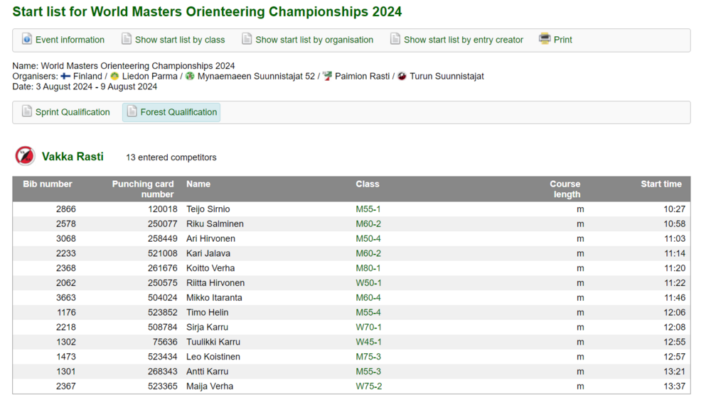 - Osallistujat ovat sarjoissa M/W35-95, vanhin osallistuja on Jämsän Retki Veikkojen Sole Nieminen (W95) synt. 1927.